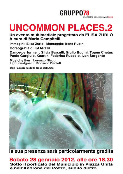 L’evento discende dai video esposti da Elisa Zurlo alla mostra “Convergenze” dello scorso ottobre 2011 al Museo Carà di Muggia, e raccolti sotto il titolo “Uncommon places”. E già in quel caso c’è stata un’espansione performativa con il danzatore Kaartik che riceveva sul corpo in movimento le immagini elettroniche che a loro volta narravano di un corpo indagato dal mezzo digitale con le sue metamorfosi, un corpo che si sdoppia, si moltiplica, si sfalda e si compenetra ad altre realtà, in una suggestiva sovrapposizione di reale e di virtuale, intensificando il senso di “luoghi non comuni”.